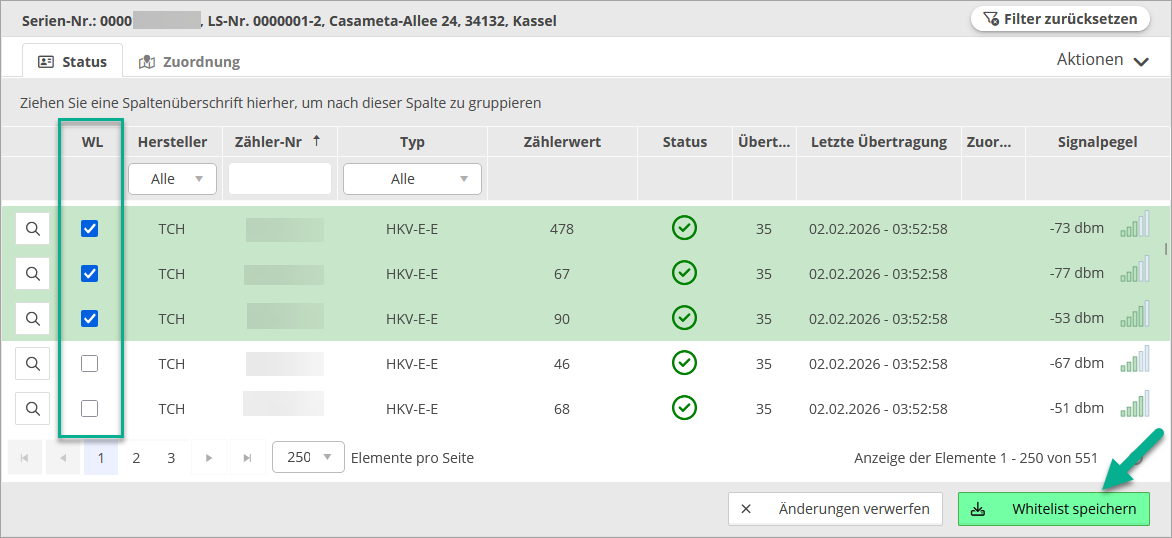 Öffnen Sie die Ansicht „Zähler / Status“, wie in „Prüfen des Suchergebnisses“ beschrieben, und markieren Sie Ihre eigenen Zähler, indem Sie diese in der Spalte „WL“ anhaken. WL steht für Whitelist oder auch „relevante Liste“.