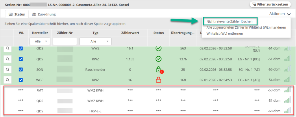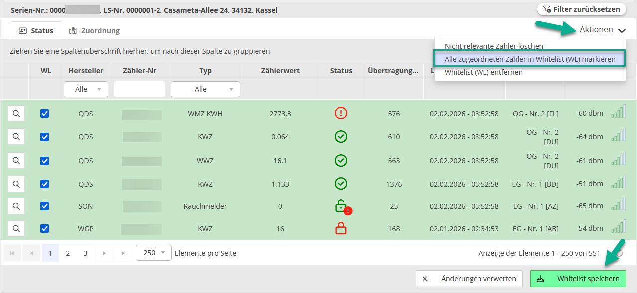 Wenn Sie bereits alle Zähler den Wohnungen bzw. der Liegenschaft zugeordnet haben, können Sie diese automatisch markieren. Nutzen Sie hierzu das Aktionsmenü „Alle zugeordneten Zähler in Whilelist (WL) markieren“: