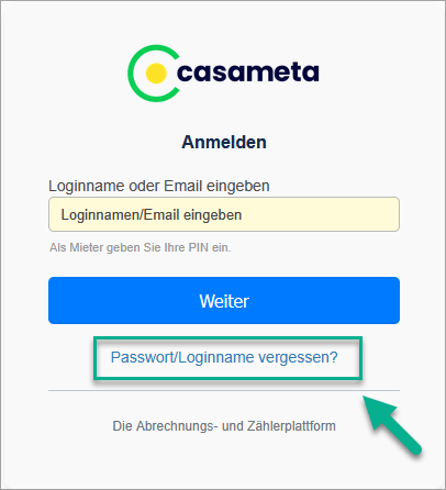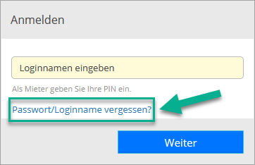 Zunächst gehen Sie zur Anmeldung. Dort geben Sie keinen Loginnamen ein, sondern wählen die Option “Passwort/Loginname vergessen?” aus: