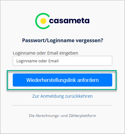In der folgenden Ansicht geben Sie entweder Ihren Loginnamen oder (falls dieser auch vergessen wurde) die mit ihrem Benutzerkonto verbundene E-Mail-Adresse an. Danach wählen Sie die Schaltfläche “Wiederherstellungslink anfordern” aus: