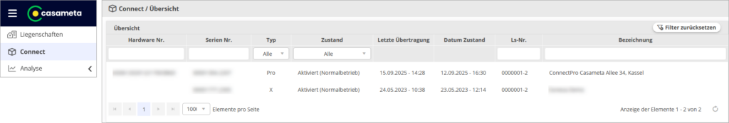 In der Übersicht der Connect-Plattform werden alle Connect angezeigt, die Ihnen zugeordnet sind. Die Spalten können durch mehrfaches Auswählen der Überschrift nach der entsprechenden Kategorie sortiert werden.