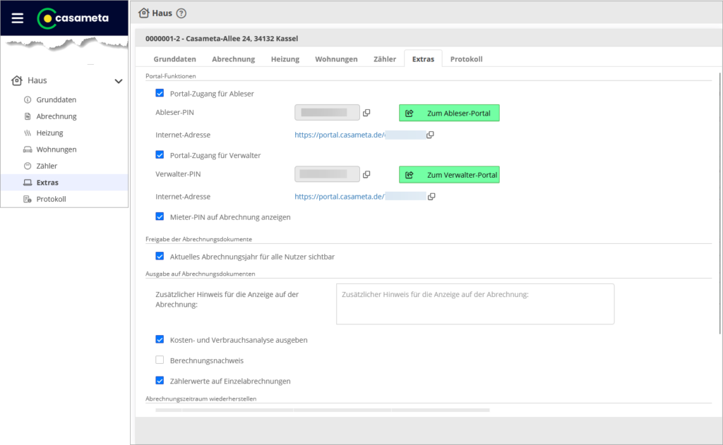 In dieser Ansicht können Sie verschiedene Einstellungen für die Abrechnung vornehmen und Berechtigungen für die Portalfunktionen verwalten.