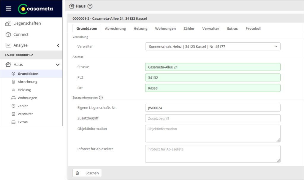 Wenn Sie nur einen Verwalter besitzen, ist dieser vorbelegt und keine Änderung notwendig. Sie können über die Ansicht “Haus / Verwalter” weitere Verwalter anlegen und an dieser Stelle der Liegenschaft zuweisen.