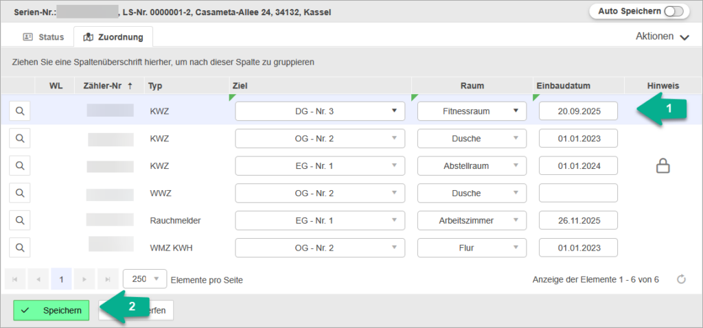 Nachdem der Zähler empfangen wurde, kann dieser in das System eingebunden werden. Hierzu muss der Zähler in der Ansicht “Zähler / Zuordnung” der entsprechenden Wohneinheit zugeordnet werden, in der dieser verbaut wurde: