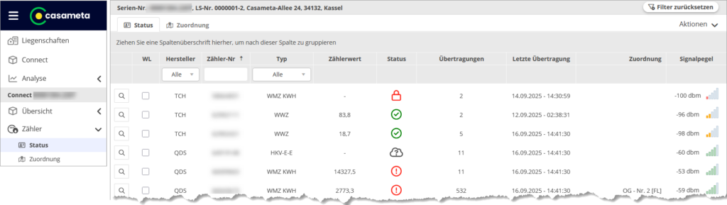 Zeigt die Signalstärke des jeweiligen Zählers an. Bei schlechten Signalpegeln ist es eventuell von Vorteil, die Position des Connects in der Liegenschaft zu verändern. Weitere Informationen hierzu finden Sie im Kapitel “Optimieren des Suchergebnis” der Anleitung zur Inbetriebnahme.