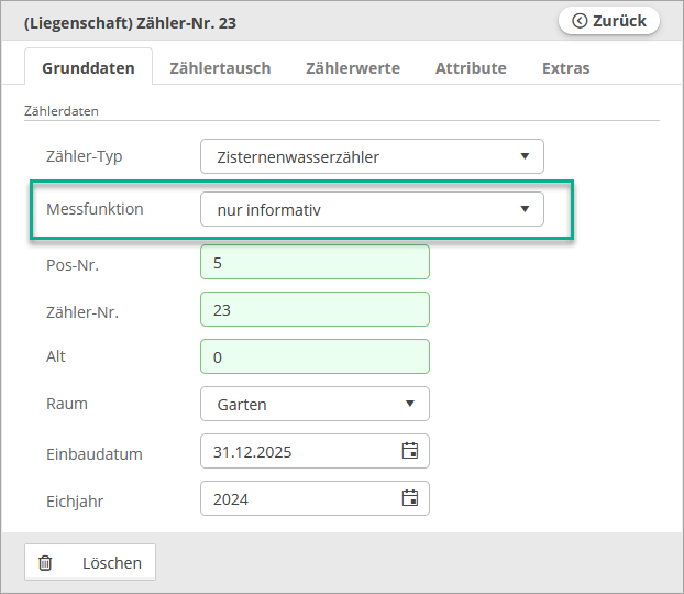 In den Grunddaten der Liegenschaftszähler ist es möglich, die Messfunktion anzugeben. Ist hier die Funktion “nur informativ” ausgewählt, so wird der Verbrauch des Zählers nicht zum Gesamtverbrauch hinzugezählt: